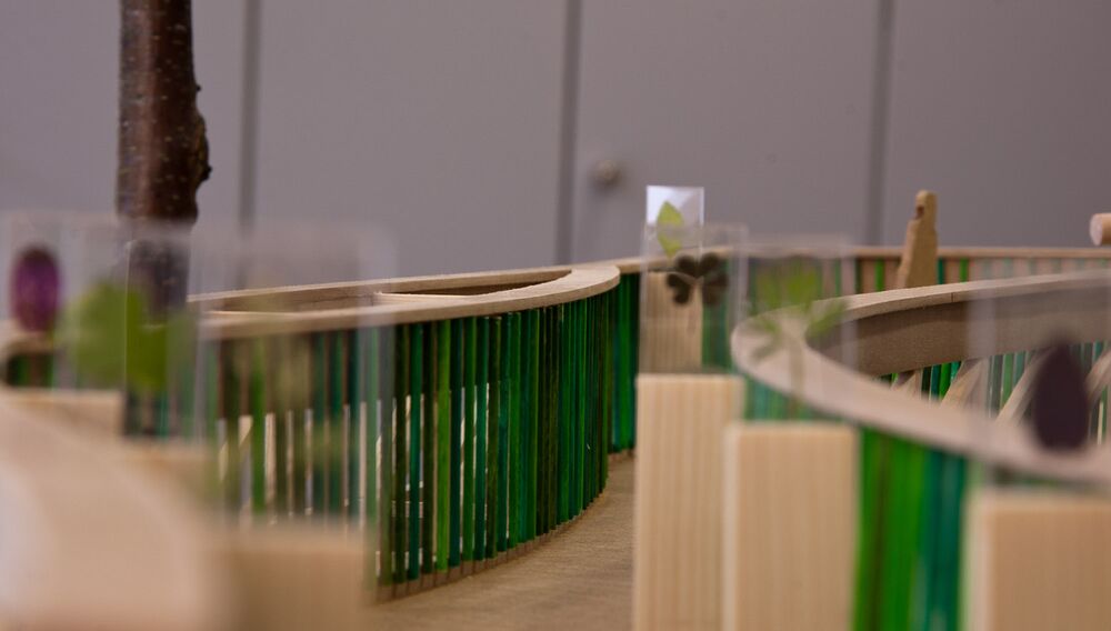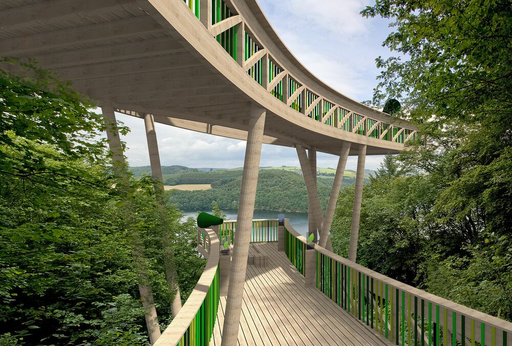 ... mit zwei sanften Schwüngen wie in aus dem „Besch“ gewachsen entdecken wir Sie - die zwei Stege für große wie auch kleine Entdecker. Die untere Ebene kann auch Papa mit dem Kinderwagen gut befahren, die Aussicht grandios, hinüber in das westliche Sauertal.Auf dem Weg zum Aussichtspunkt der Plattform bekommen wir Informationen zu Flora und Fauna, über kleine Gucklöcher die sich wie Astlöcher im Geländer auftun, können wir Vögel in den Bäumen beobachten, über andere können wir sogar die Kronen der Bäume ganz nah erleben. Für den mutigen Entdecker wie mich, der der kleinen Schwester seinen Mut beweisen will gibt es noch den hohen Steg. Um ihn zu erreichen muss ich die gegenüberliegende Naturtreppe nach oben steigen. Auf diesem Weg gibt es schon allerhand zu bestaunen z.B. Farne die mir den Weg verengen, weil es dort so schön schattig. Oben angekommen, staune ich nicht schlecht, hat sich doch eine Douglasie den Weg „durch“ den Steg gebahnt. Nun kann ich sie von oben begutachten. In zwei Jahren, wenn meine Schwester in die Schule kommt, denke ich bei mir, wird sie mir schon über den Kopf gewachsen sein ...