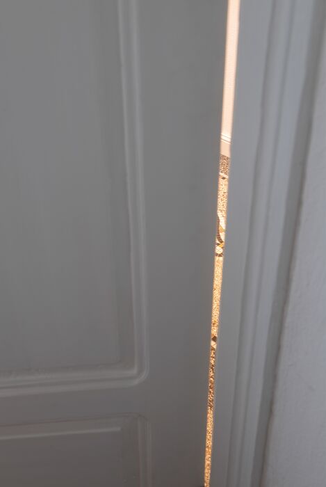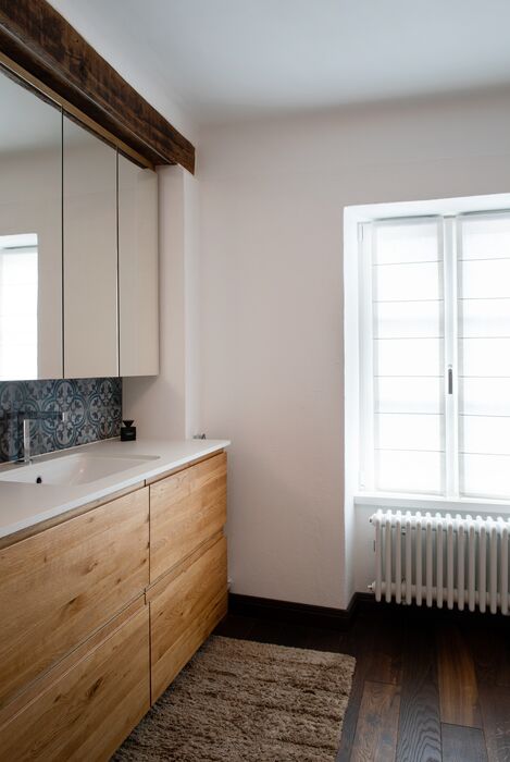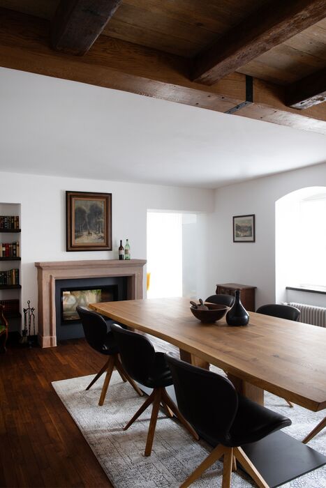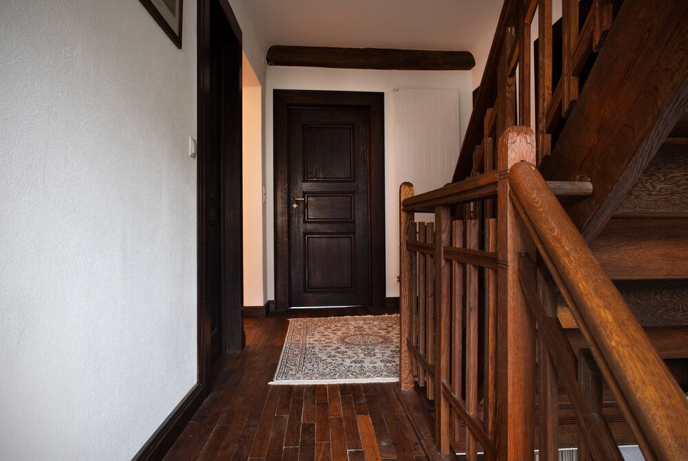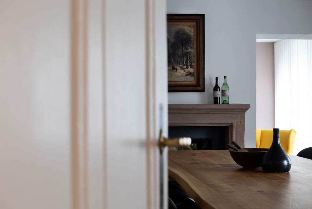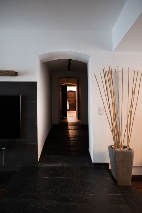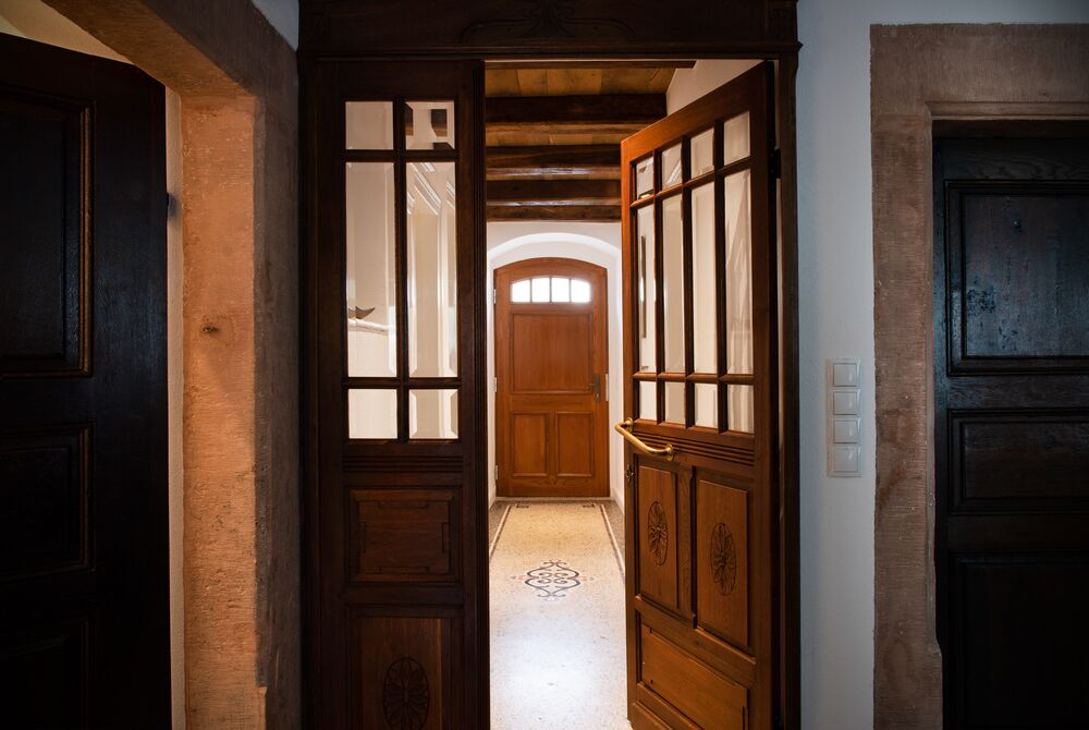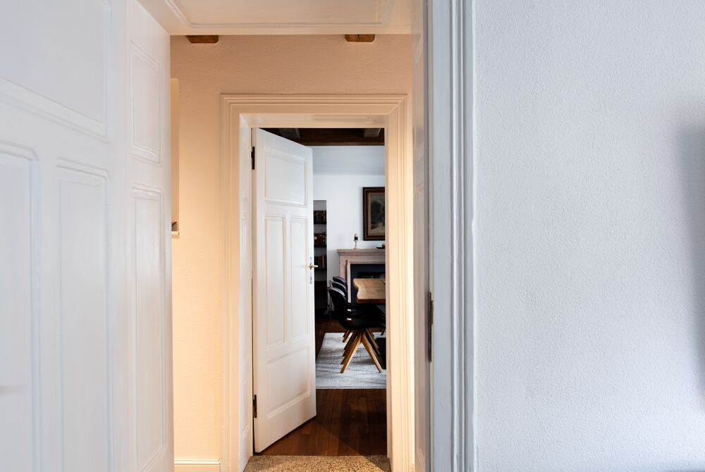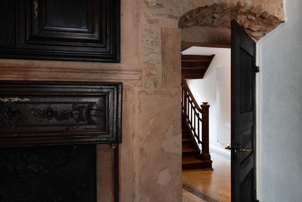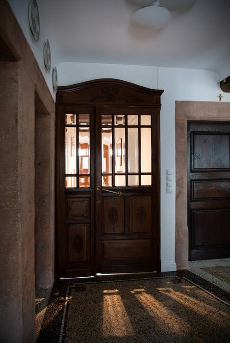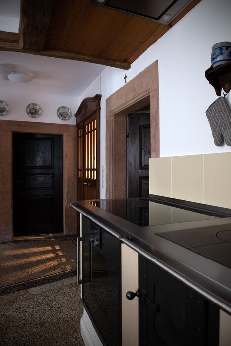 Die Junge Familie bewohnt das Vorderhaus mit seinen bis ins kleinste Detail restaurierten Bauteilen (Holzbalkendecken, Holzböden, Terrazzoboden…) und Einbauten (Takeschaaf, Holztreppe, Innentüren…).