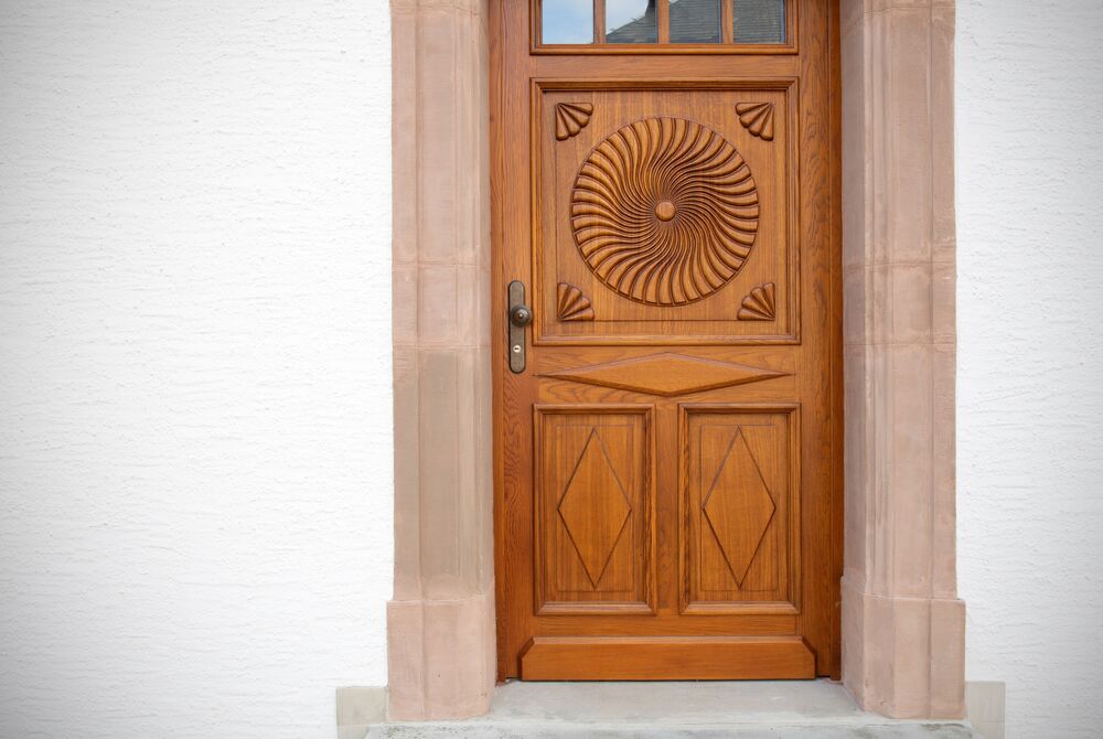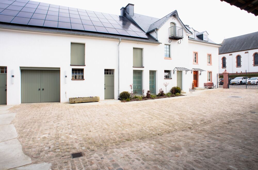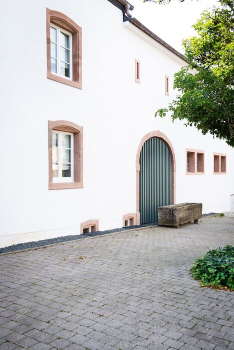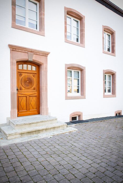 Zur Straßenfront das klassische Bauernhaus von 1760 mit detailliert gestalteter Eingangstüre, Restaurierten Sandsteingewänden, Rundbogentor, kleinen Stallfenstern und Lüftungsluken im Obergeschoss, Rückseitig/ Hofseitig funktionell