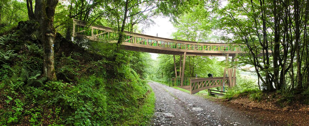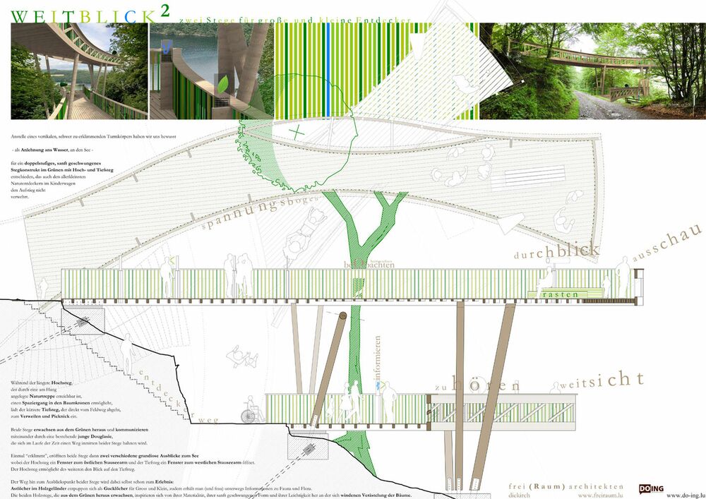 ... mit zwei sanften Schwüngen wie in aus dem „Besch“ gewachsen entdecken wir Sie - die zwei Stege für große wie auch kleine Entdecker. Die untere Ebene kann auch Papa mit dem Kinderwagen gut befahren, die Aussicht grandios, hinüber in das westliche Sauertal.Auf dem Weg zum Aussichtspunkt der Plattform bekommen wir Informationen zu Flora und Fauna, über kleine Gucklöcher die sich wie Astlöcher im Geländer auftun, können wir Vögel in den Bäumen beobachten, über andere können wir sogar die Kronen der Bäume ganz nah erleben. Für den mutigen Entdecker wie mich, der der kleinen Schwester seinen Mut beweisen will gibt es noch den hohen Steg. Um ihn zu erreichen muss ich die gegenüberliegende Naturtreppe nach oben steigen. Auf diesem Weg gibt es schon allerhand zu bestaunen z.B. Farne die mir den Weg verengen, weil es dort so schön schattig. Oben angekommen, staune ich nicht schlecht, hat sich doch eine Douglasie den Weg „durch“ den Steg gebahnt. Nun kann ich sie von oben begutachten. In zwei Jahren, wenn meine Schwester in die Schule kommt, denke ich bei mir, wird sie mir schon über den Kopf gewachsen sein ...