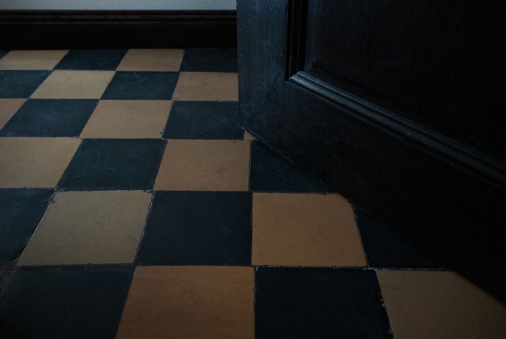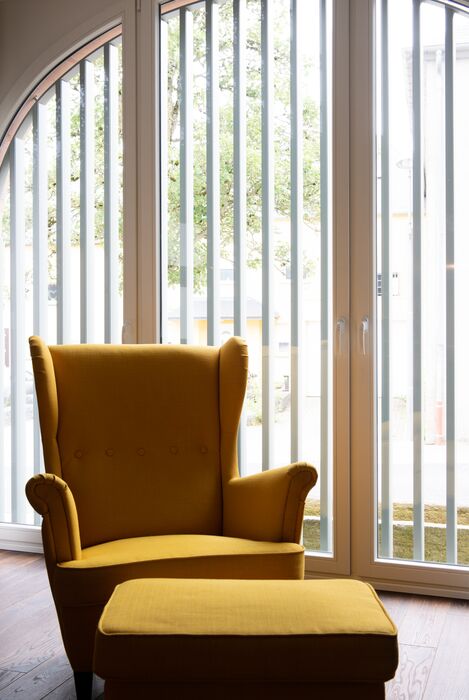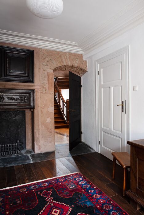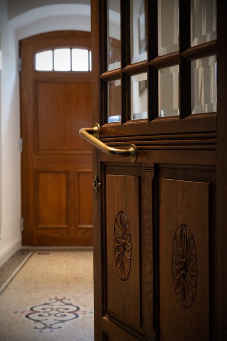 Die Junge Familie bewohnt das Vorderhaus mit seinen bis ins kleinste Detail restaurierten Bauteilen (Holzbalkendecken, Holzböden, Terrazzoboden…) und Einbauten (Takeschaaf, Holztreppe, Innentüren…).