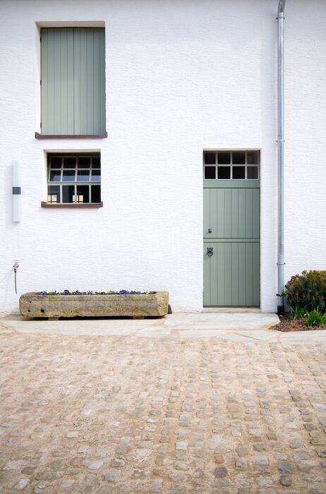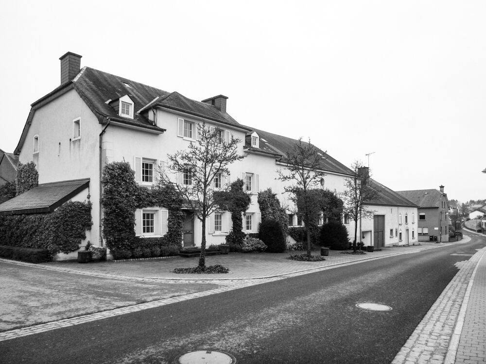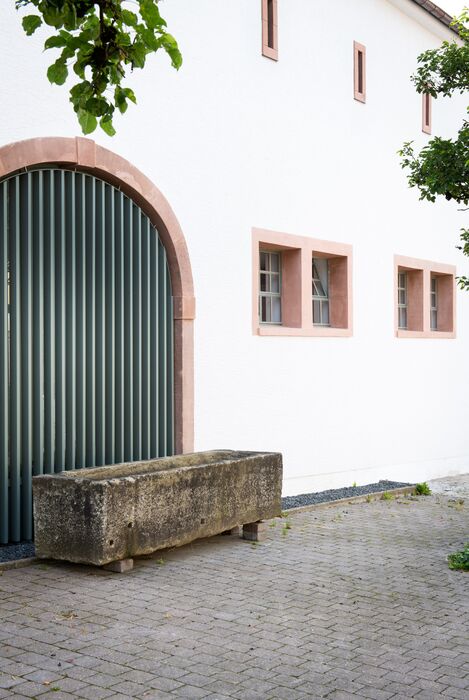 Zur Straßenfront das klassische Bauernhaus von 1760 mit detailliert gestalteter Eingangstüre, Restaurierten Sandsteingewänden, Rundbogentor, kleinen Stallfenstern und Lüftungsluken im Obergeschoss, Rückseitig/ Hofseitig funktionell